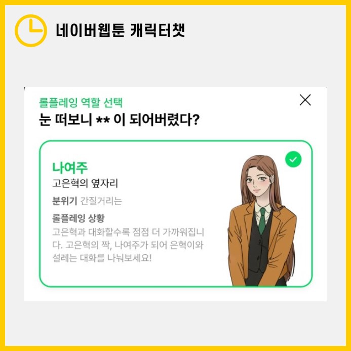 현재 제공되는 역할은 고등학생 고은혁의 옆자리인 '나여주'만 선택할 수 있습니다.