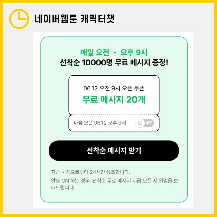 현재는 무료 메시지 증정 이벤트도 진행 중이라 매일 오전, 오후 9시마다 선착순 10,000명에게 무료 메시지 20개를 증정하고 있습니다. 저도 이 이벤트를 통해 대화를 시작하게 되었습니다.