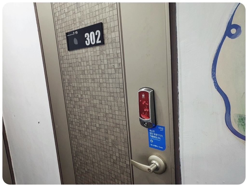 제가 묵은 방은 오션뷰를 자랑하는 302호였습니다. 문에는 도어락이 설치되어 있어 보안 걱정 없이 편하게 지낼 수 있었습니다. 다만 엘리베이터가 없어 짐이 많다면 계단을 오르내리기 힘들 수 있으니 짐을 간소하게 챙기는 것이 좋습니다.