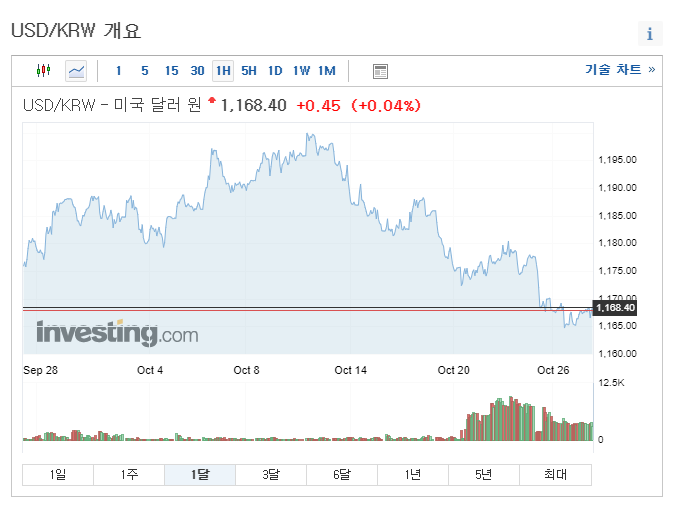 시장의 지수가 떨어질수록 상승하는 자산이 필요하다고 느꼈다. 이에 대한 선택으로는 인버스, 채권, 달러 등이 있었다. 금, 천연가스 등의 원자재도 대안이 될수도있겠다. 다양한 선택지 중에서 내가 선택한 것은 달러였다. 저점에 산 달러를 고점에 매도해서 환차익을 얻을 수도 있고, 비싸게사서 묶인 달러는 미국주식에 재투자 할 수 있어 매력적으로 느껴졌다.