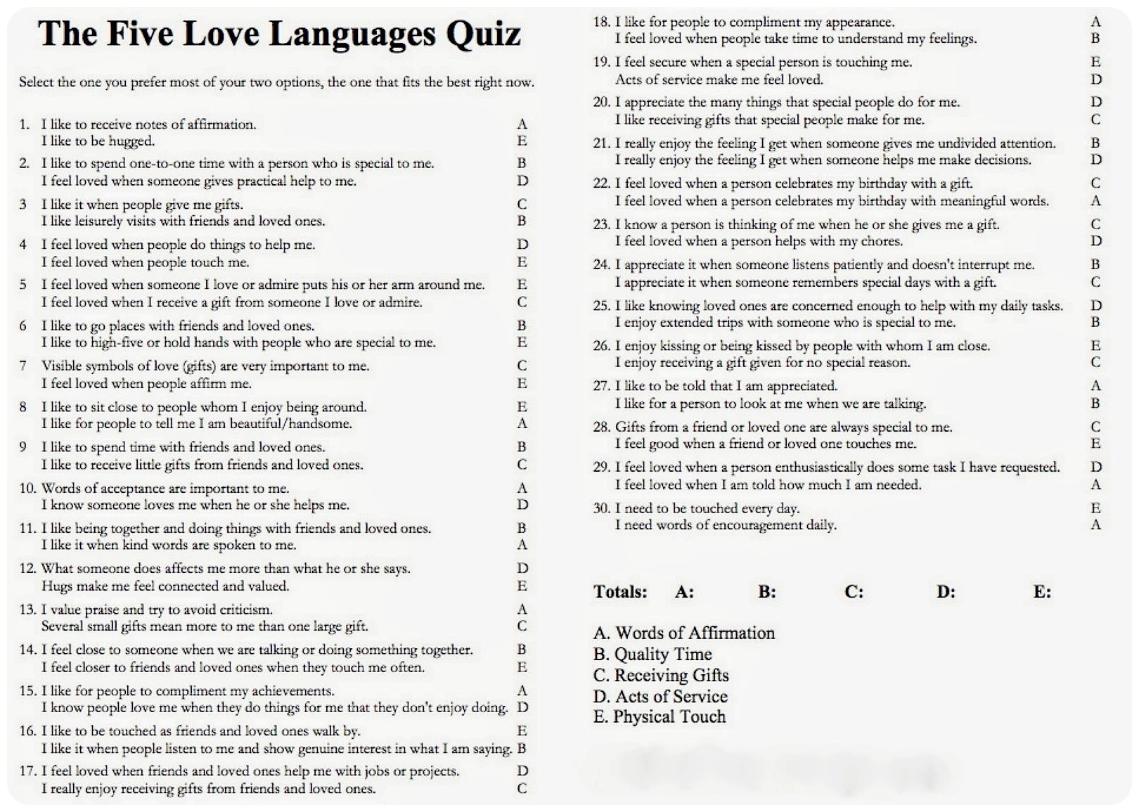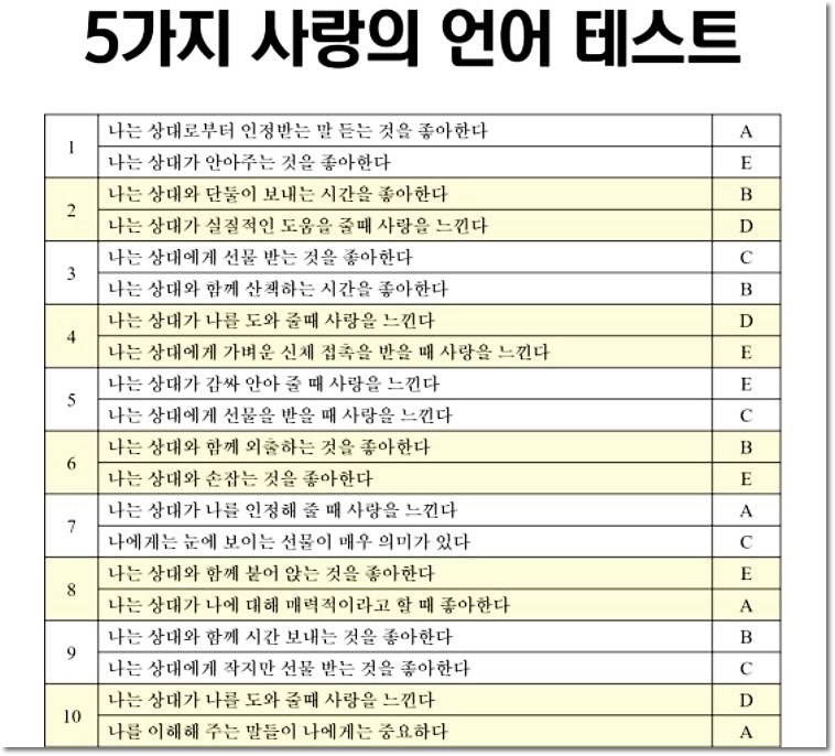 개리체프먼의 다섯가지 사랑의 언어 테스트에 대해 알아보았습니다. 오늘 테스트를 통해 여러분들이 인간관계에 있어 나와 다른 타인을 대할 때 더 편해지시길 바랍니다.