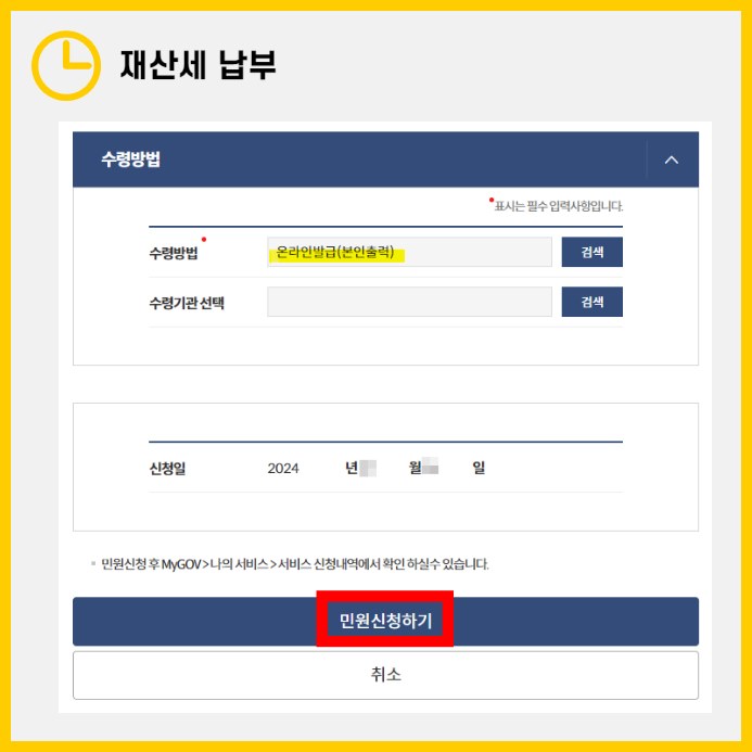 12. '수령 방법'을 온라인 발급(본인 출력)으로 선택하고 '민원 신청하기'를 클릭하여 절차를 완료합니다.