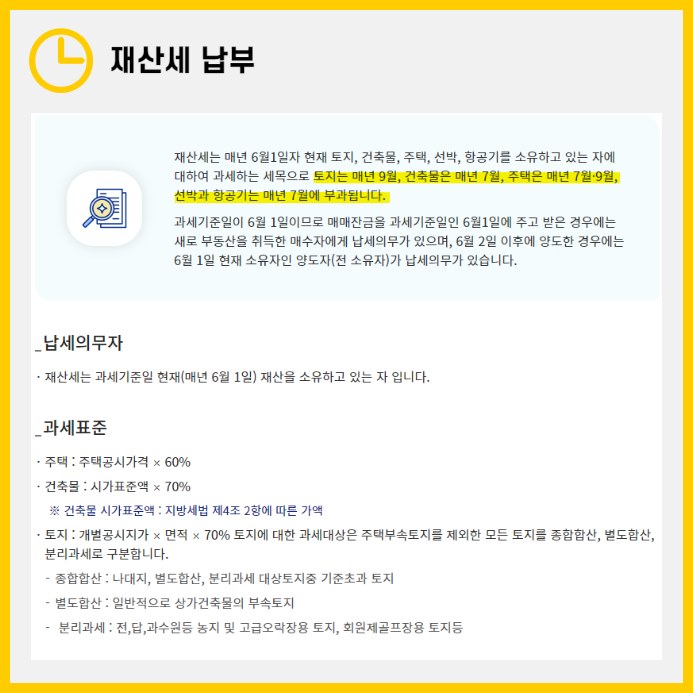 재산세는 매년 6월 1일을 기점으로 소유자에게 부과됩니다. 즉 6월 1일 이후 소유하고 있는 재산에 대해 세금이 부과됩니다. 예를 들어, 6월 1일 전에 재산을 매도했다면 매수자가 세금을 부담하게 됩니다.