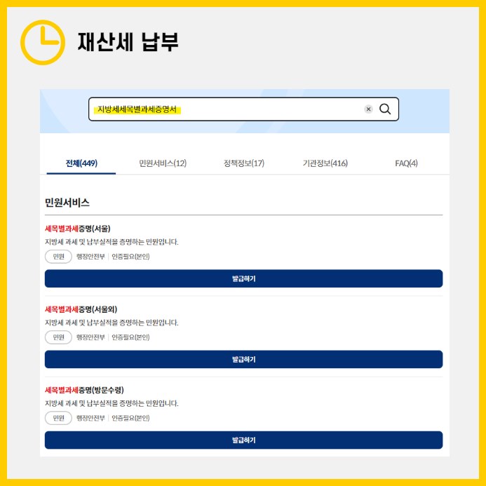 홈페이지 검색창에 '지방세 세목별 과세증명서'를 입력한 뒤, '지방세 세목별 과세증명서'를 클릭합니다. 이때, 발급받을 지역을 선택합니다.