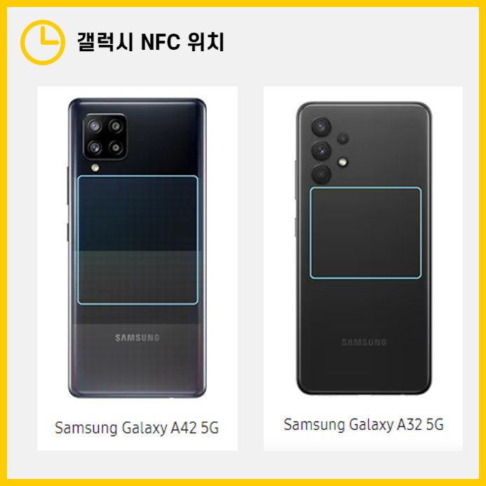- A 시리즈: 대부분 카메라 렌즈 옆 여백에 NFC가 위치해 있습니다. 해당 모델에는 A55, A54, A53, A35, A34, A33, A25, A23, A22, A15, A14, A13, A71, A70, A60, A51, A50s, A8s 등이 포함됩니다.