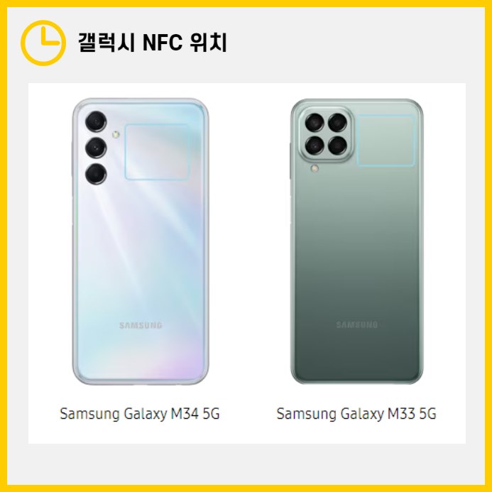 - M34, M33: 카메라 렌즈 오른쪽 여백에 NFC가 위치해 있습니다.