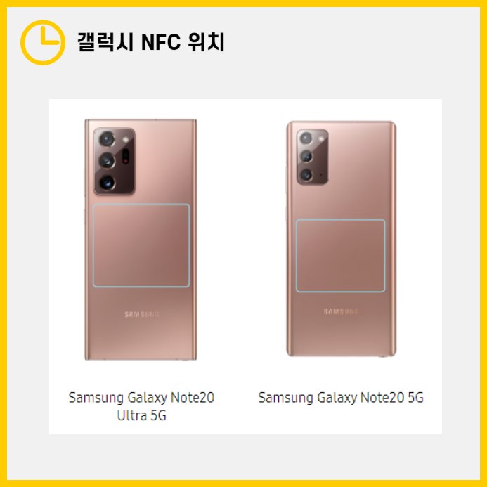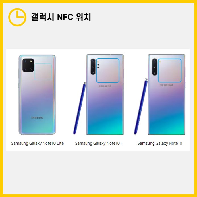 - 노트10 시리즈: 카메라 렌즈 주변에 위치하여, 결제나 데이터 전송 시 카메라 주변을 단말기에 가까이 대야 합니다.