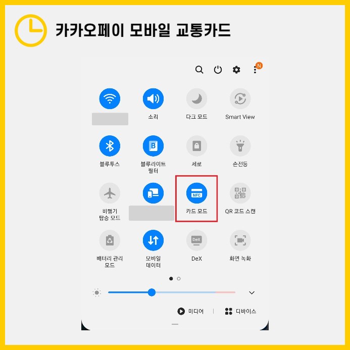 휴대폰의 NFC 기능이 활성화되어 있는지 확인하세요. 화면 상단 메뉴바를 내려 NFC 기능을 켜주세요. 카카오페이 앱에서 '기본모드'와 '카드모드' 중 하나를 선택할 수 있는데, 기본모드는 더 많은 기능을 제공하지만 배터리 소모가 크기 때문에 카드모드를 추천합니다.