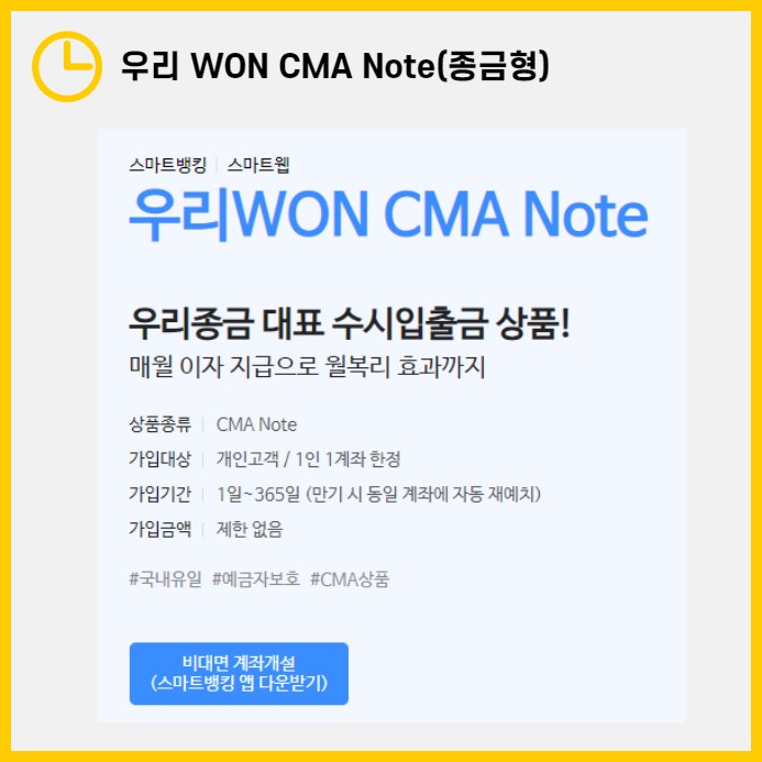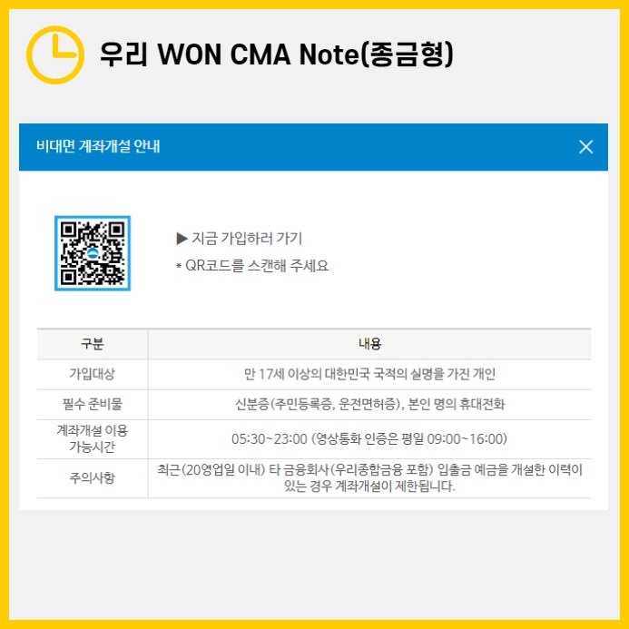 우리 WON CMA Note는 비대면으로 간편하게 가입할 수 있습니다. 스마트뱅킹이나 모바일 웹을 통해 가입 가능하며, 가입 가능 시간은 평일 주말 무관하게 오전 5:30부터 오후 11시까지입니다. 다만, 영상통화 인증이 필요한 경우 평일 오전 9시부터 오후 4시 사이에만 가능하니 참고하시기 바랍니다. 최근 20영업일 이내 타 금융회사에서 입출금 예금을 개설한 이력이 있는 경우에는 계좌 개설이 제한될 수 있습니다.