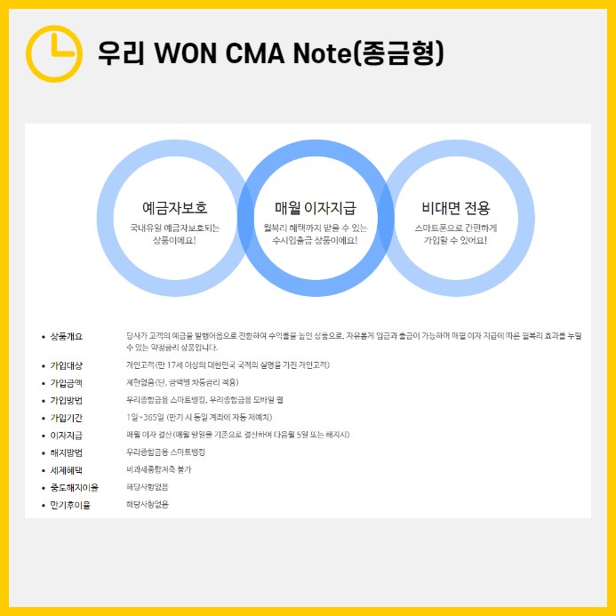 우리종합금융의 대표 CMA 상품인 '우리 WON CMA Note'는 발행어음을 통해 수익률을 높이는 방식으로 운영됩니다. 이 상품의 가장 큰 특징은 자유로운 입출금이 가능하면서도 매월 이자가 지급되는 월복리 효과를 제공한다는 점입니다.