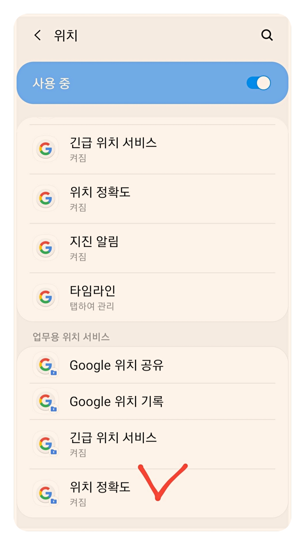안드로이드는 [설정] > [위치] > [위치 서비스 클릭] > [Google 위치 정확도]의 메뉴로 활성화를 해둡니다.