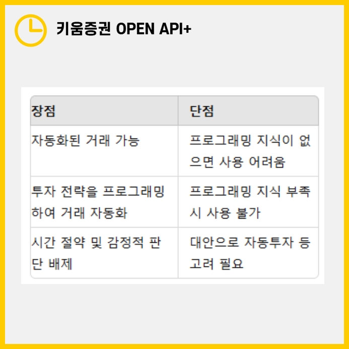 하지만 이러한 장점에도 불구하고, 키움증권 OPEN API+는 단점도 존재합니다. 가장 큰 단점은 프로그래밍 지식이 없으면 사용이 어렵다는 점입니다. 실제로 프로그래밍 경험이 없는 투자자들은 이 서비스를 이용하기 어렵기 때문에, 다른 대체 수단을 고려해야 할 수도 있습니다. 예를 들어, 키움증권에서 제공하는 자동투자 서비스 등을 활용할 수 있습니다.