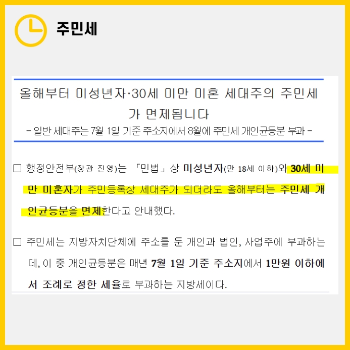 주민세는 일부 청년에게 면제 혜택을 제공하고 있습니다. 만 30세 미만의 미혼 세대주는 주민세를 면제받을 수 있습니다. 이 제도는 청년층의 경제적 부담을 덜어주기 위한 정책으로, 미성년자 역시 주민세 면제 대상에 포함됩니다. 다만, 부모와 같은 세대를 구성하고 있다면 면제 대상에서 제외되므로, 이 부분을 주의해야 합니다.