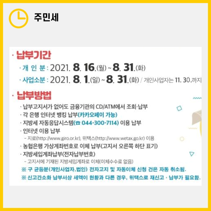 주민세는 매년 8월 16일부터 8월 31일까지 납부해야 합니다. 납부 방법은 간단하게 온라인에서 처리할 수 있으며, 가장 대표적인 방법으로 위택스(www.wetax.go.kr)와 스마트 위택스 앱을 사용할 수 있습니다.