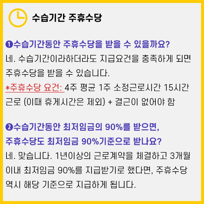 즉, 근로자는 주휴수당 조건만 갖춘다면 수습기간이라하더라도 주휴수당을 받을 수 있습니다.