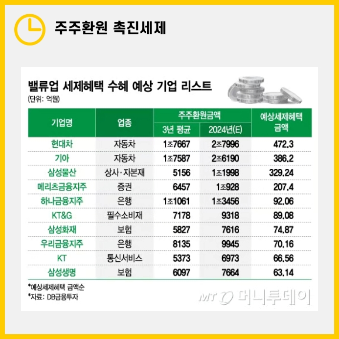 주주환원 촉진세제의 혜택을 받을 가능성이 높은 대표적인 기업들로는 현대차, 기아, 삼성물산 등이 있습니다. 배당을 잘 주는 업종에는 금융, 통신, 필수소비재, 호텔, 레저 등이 있으며, 더 나아가 자동차, 화장품 업종에서도 주주환원에 적극적으로 나설 가능성이 있습니다. 물론, 주주환원우수기업에 투자한다고 해서 무조건적인 수익을 기대할 수는 없습니다. 기업의 재무상황, 경영전략 등을 종합적으로 고려한 후 투자 결정을 내리는 것이 현명합니다.