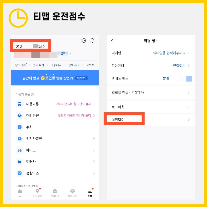 3. 회원 탈퇴 진행: ‘회원 탈퇴’를 진행하면 TMAP 운전점수가 초기화됩니다. 그러나 이때 기존에 쌓아둔 운전습관 점수, 즐겨찾기, 최근 목적지 등의 정보가 모두 삭제되므로 주의해야 합니다.