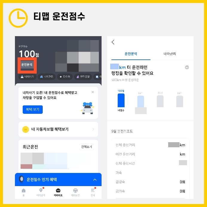 처음 차를 구입하고 운전 습관을 개선하려고 할 때 TMAP 운전점수를 활용해 보았습니다. 특히, 이 점수가 높은 경우 특별한 할인 혜택을 받을 수 있다는 것을 알게 되었습니다. 저의 경우 할인을 받기위해 꾸준히 점수를 관리했는데요, 운전 습관을 더 효율적으로 파악하고자 다음과 같은 방법을 활용했습니다.
