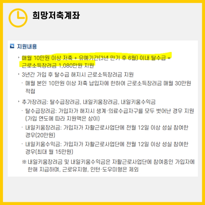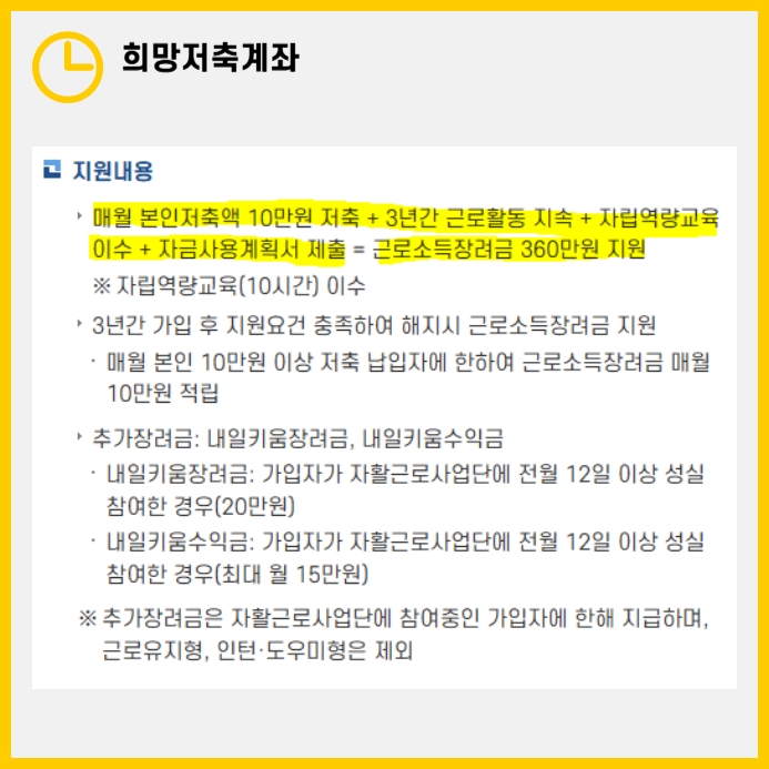 - 근로 기준: 현재 근로 중이며 근로·사업 소득이 있는 가구. 이 계좌를 통해 매달 10만 원을 저축하고 3년 동안 근로활동을 지속하며 자립 역량 교육을 이수하면, 근로소득장려금 360만 원을 받을 수 있습니다.
