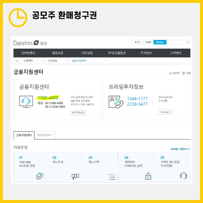 2. 고객센터를 통한 유선 신청 대신증권의 환매청구권은 어플이나 홈페이지를 통해 처리할 수 없으며, 고객센터 전화(1588-4488)를 통해서만 가능합니다. 고객센터 운영 시간인 평일 오전 8시에서 오후 4시 사이에 전화 상담을 통해 신청해야 합니다. 신청 전 공모주가 보유된 증권 계좌가 유지되어야 환불 처리가 가능하니, 이 점을 반드시 확인하세요.