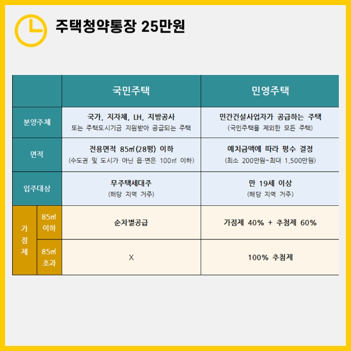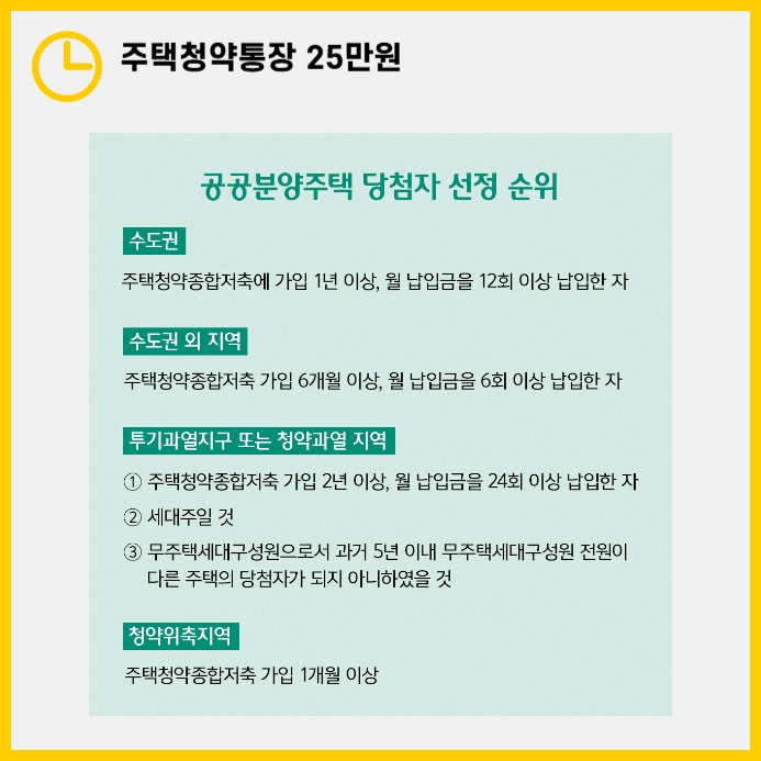 민간청약에서는 무주택 기간과 부양가족 수 등 다른 요소가 주요합니다. 따라서 민간청약을 생각하고 있다면, 매달 25만원 전액을 납입하지 않더라도 최소한의 납입만 유지하고 나머지 자산은 다른 재테크에 투자하는 것도 좋은 선택일 수 있습니다. 민간청약의 경우 납입 금액보다도 납입 횟수와 기간이 청약에서 더 중요한 역할을 하기 때문입니다.