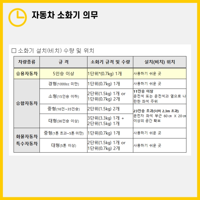 - 승합차 경형: 0.7kg 소화기 1개
