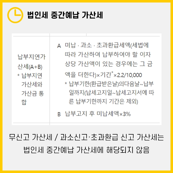 법인세 중간예납 가산세는 '납부지연 가산세'로 '납부지연가산세(A) + 가산금(B)'으로 나뉘어 있습니다.