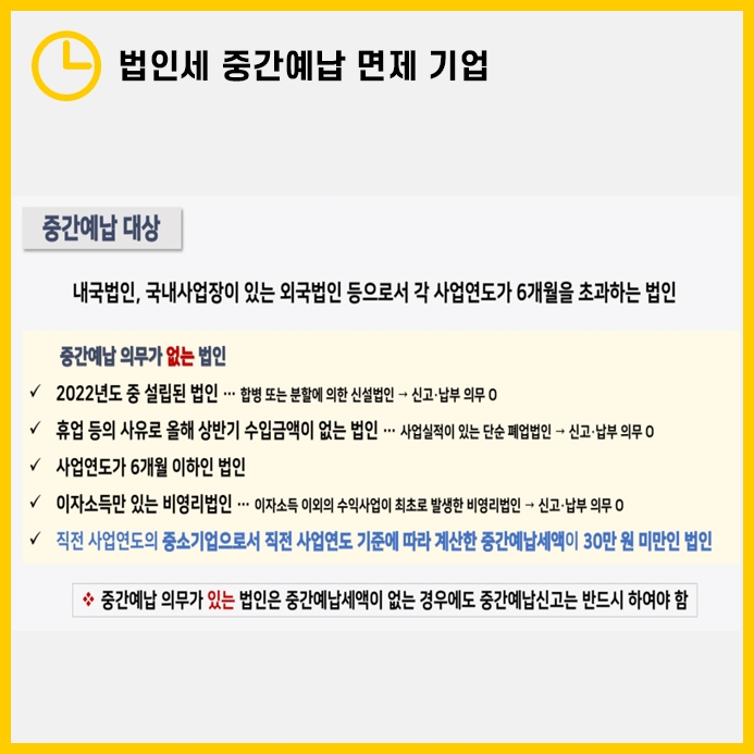 - 직전사업연도의 중소기업으로서 계산한 중간예납세액이 30만원 미만인 법인