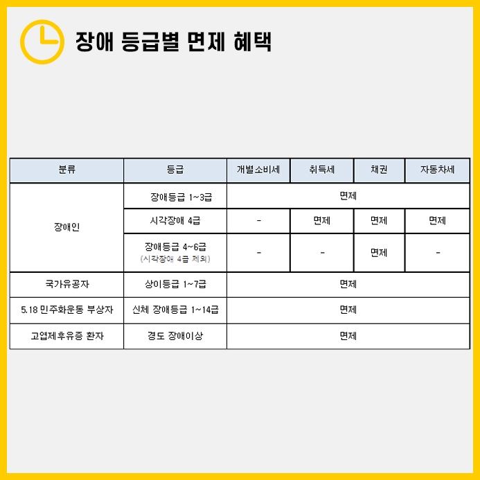 장애등급 또는 차량의 종류에따라 자동차 취등록세 면제를 받을 수 있습니다.