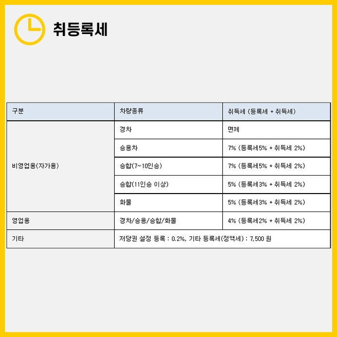 차량종류와 차량의 용도에 따라 취등록세는 상이합니다.