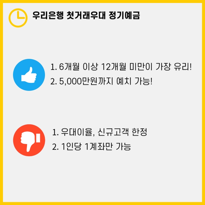 다만, 기존 고객은 우대 조건 충족이 어렵다는 점이 아쉬운 부분입니다. 저는 이미 우리은행 계좌를 보유하고 있어 우대금리를 적용받지 못했지만, 신규 고객이라면 이 상품을 적극 추천합니다. 간단한 가입 절차와 높은 금리를 통해 목돈을 효과적으로 운용할 수 있습니다. 우리은행 첫거래우대 정기예금을 통해 여러분의 금융 자산을 더욱 효율적으로 관리해 보세요!
