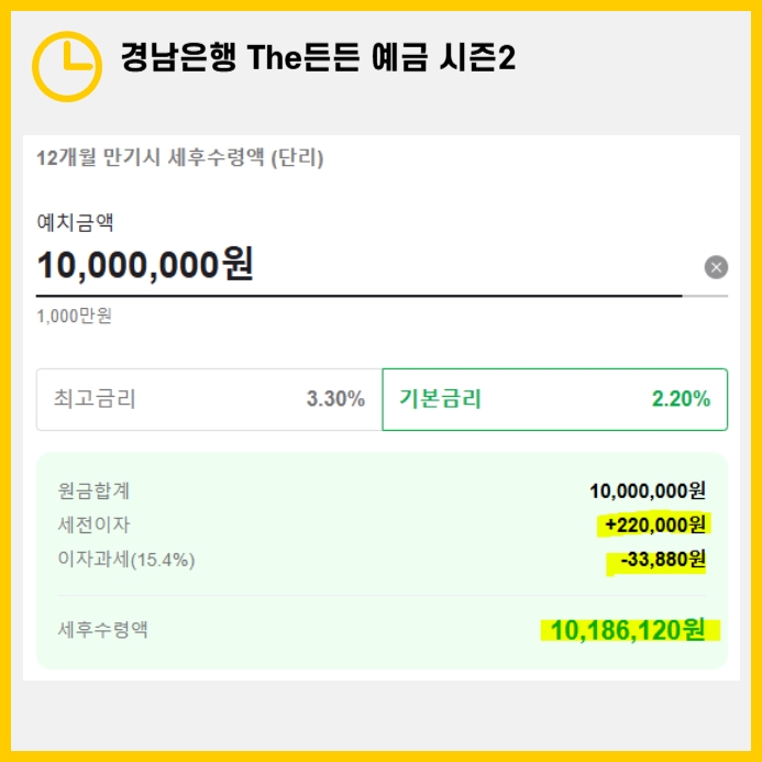예를 들어, 1000만 원을 12개월 동안 예치하면 다음과 같은 결과를 기대할 수 있습니다.