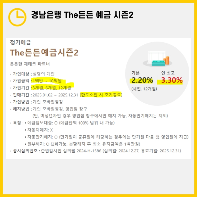 하지만 한정된 판매 한도로 인해 조기 마감 가능성이 크니, 관심 있는 분들은 서둘러 가입해보세요. 경남은행 'The든든 예금 시즌2'는 경제적 안정을 위한 든든한 선택이 될 것입니다.