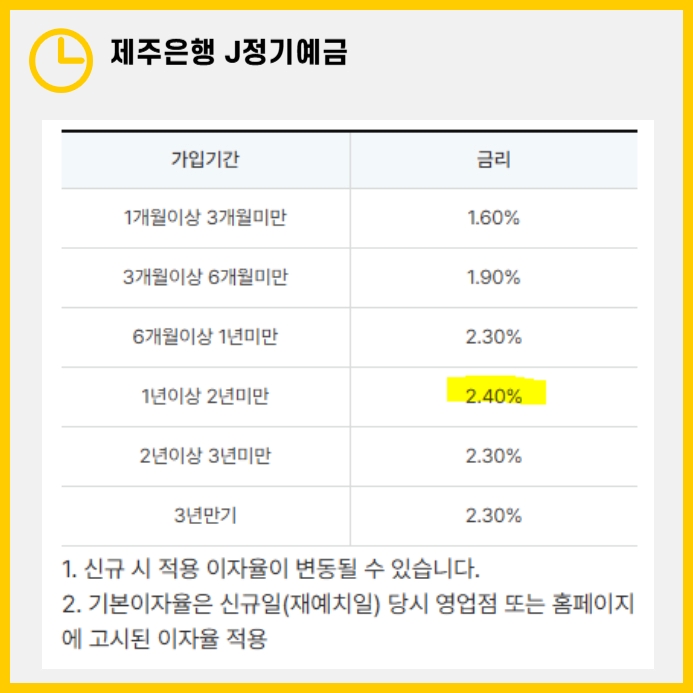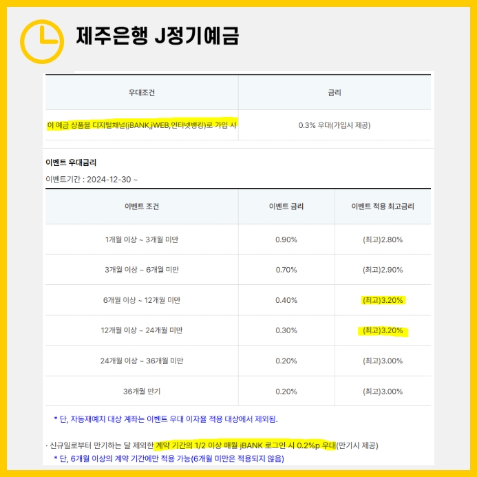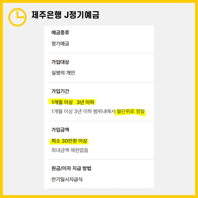 이상 예금 금리 높은 은행을 찾고있던 분들께 도움이 될 J정기예금에 대해 알아보았습니다. 특히 특판 금리 상품은 한정된 기간 동안만 제공되는 경우가 많으니, 조건에 부합하는 분들은 놓치지 말고 가입을 고려해 보세요. 높은 금리와 유연한 조건을 갖춘 제주은행 J 정기예금으로 현명한 재테크를 시작해 보시길 바랍니다.