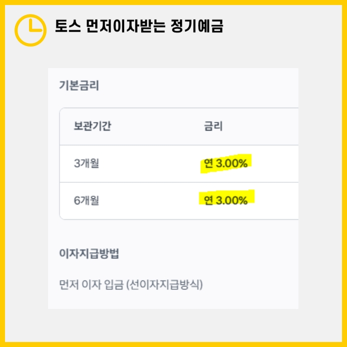 이 상품은 단순한 예치 수단을 넘어, 미리 받은 이자를 통해 다양한 가능성을 열어주는 도구로 활용될 수 있습니다. 짧은 만기와 높은 이율을 갖춘 '먼저받는이자' 정기예금은 목돈을 효율적으로 활용하려는 분들에게 적극 추천합니다. 토스뱅크 통장을 통해 이 상품을 체험하며 더 큰 재테크의 기회를 누려보세요.