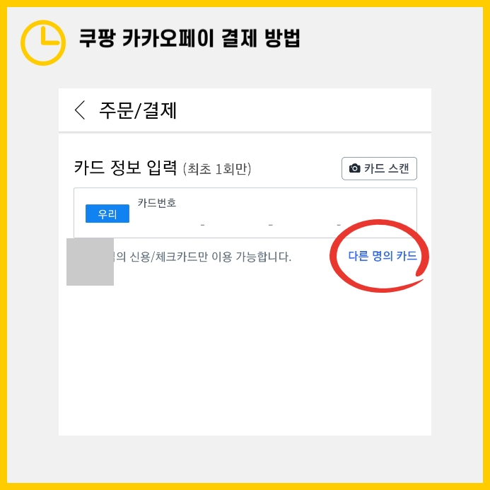 - 결제 수단에서 카카오페이를 지원하는 ‘신용/체크카드’를 선택합니다.
