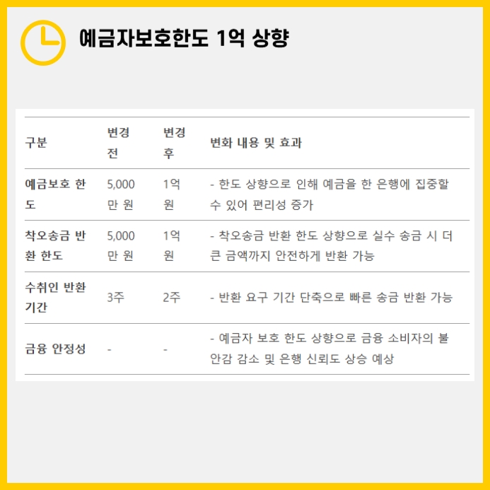 - 금융 안정성 강화: 보호 한도 상향으로 소비자의 불안감이 줄어들고, 은행의 신뢰도 상승이 기대됩니다.