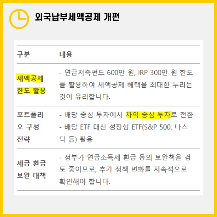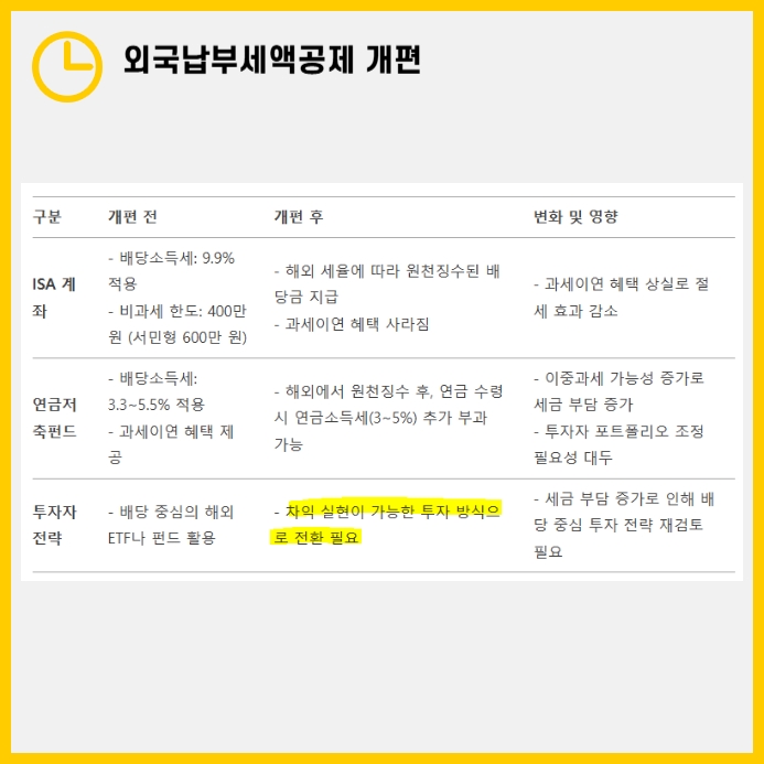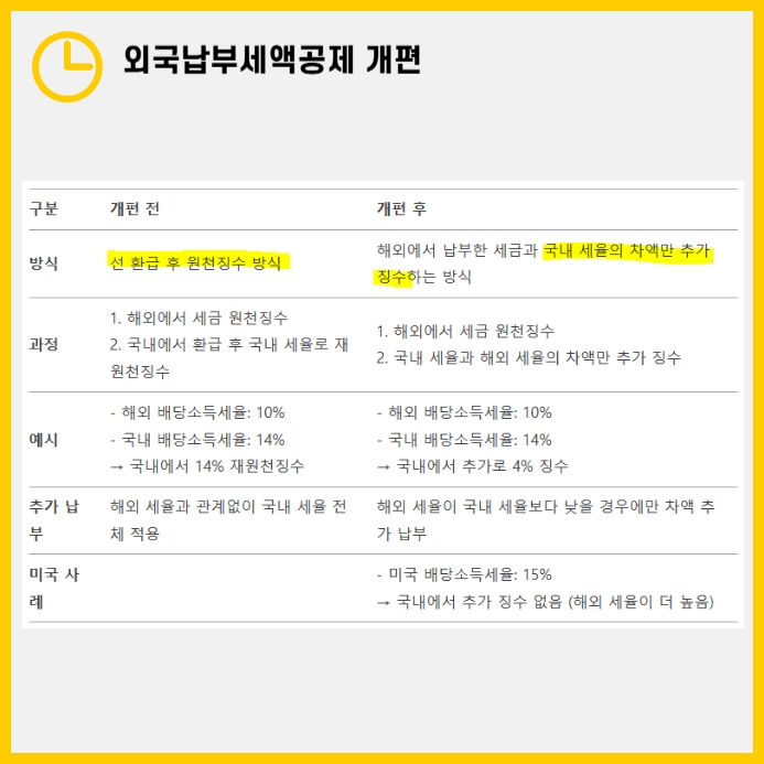 - 기존에는 해외 배당소득에 대한 원천징수세액을 국내 세율과 조정받을 수 있었으나, 이제는 해외 세율이 국내보다 낮을 경우 추가 납부해야 합니다.