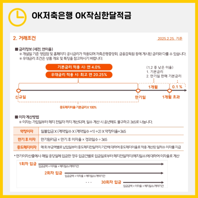 OK저축은행이 출시한 OK작심한달적금은 초단기 정액식 적금으로, 30일 동안 매일 일정 금액을 저축하는 방식으로 운영됩니다. 최소 5천 원부터 1만 원까지 선택할 수 있으며, 1인 1계좌만 개설할 수 있습니다. 이 적금의 가장 큰 매력은 높은 금리인데, 기본 금리는 연 4.0%이지만 특정 조건을 충족하면 최고 연 20.25%까지 적용받을 수 있습니다.