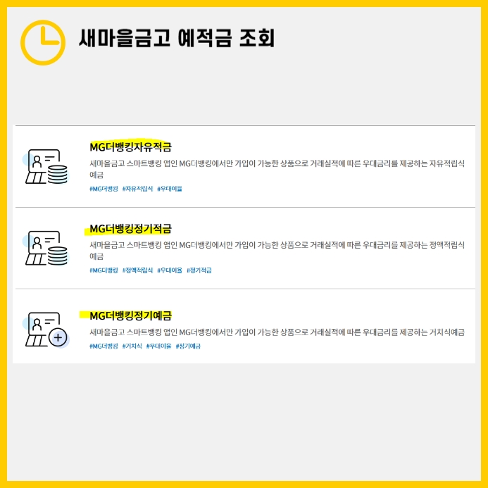 마지막으로 MG더뱅킹 정기 예금은 일정 금액을 한 번에 맡기고, 정해진 기간이 지난 후 이자를 포함해 찾을 수 있는 상품입니다.
