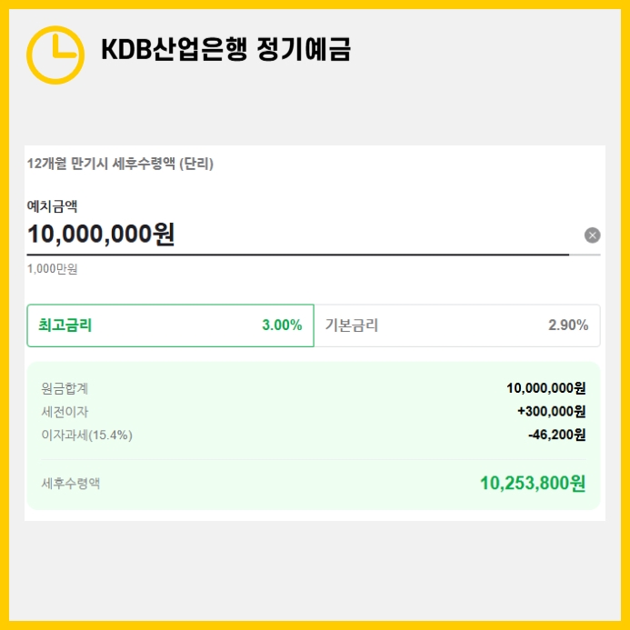 1,000만 원을 12개월 만기로 예치했을 경우, 예상되는 세전 이자는 30만 원입니다.