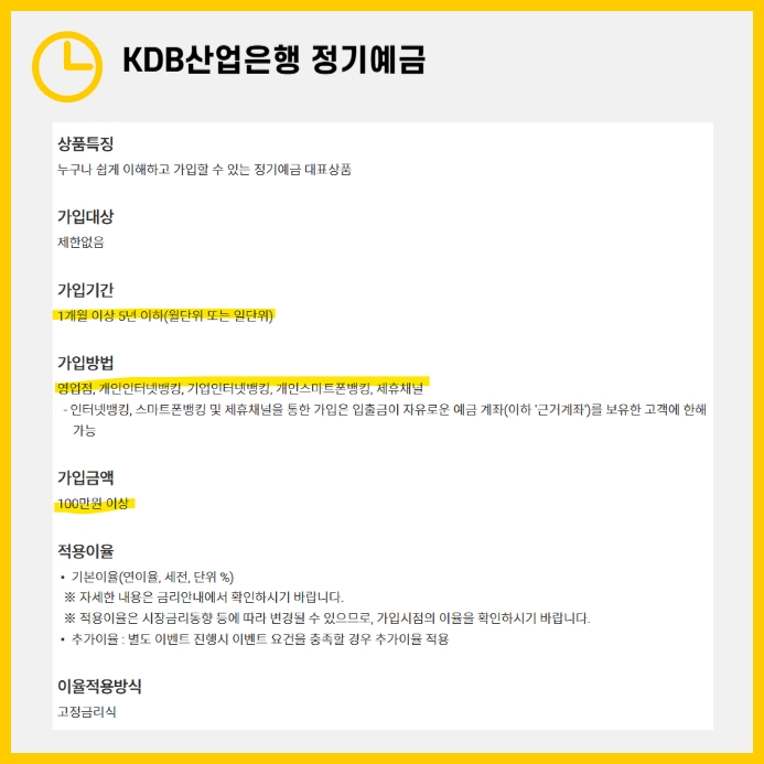 이 정기예금 상품은 일정 기간 동안 확정된 금리를 제공하며, 원금이 보장되는 안전한 금융상품입니다. 가입 대상에 제한이 없으며, 최소 100만 원부터 예치할 수 있습니다. 가입은 영업점을 직접 방문하거나, 인터넷뱅킹과 모바일뱅킹을 통해 간편하게 진행할 수 있습니다. KDB산업은행은 국책은행으로서 신뢰도가 높고, 예금자 보호법에 따라 5,000만 원까지 보호받을 수 있어 안전한 자산 운용을 원하는 분들에게 추천할 만한 상품입니다.