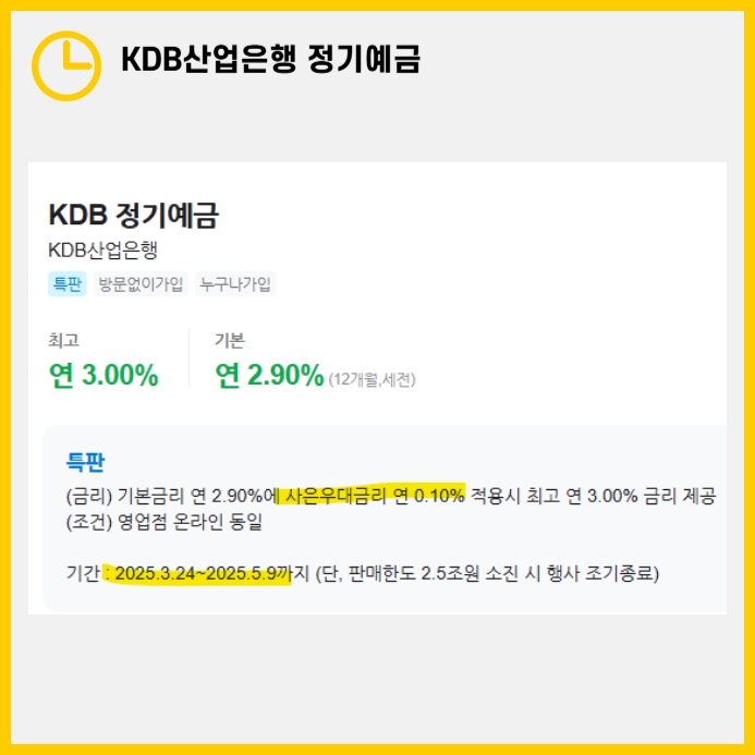 단, 특판 한도가 조기 소진될 가능성이 있으니, 빠르게 가입 여부를 결정하는 것이 중요합니다. 이번 KDB산업은행 정기예금 특판이 여유 자금을 효율적으로 운용하는 데 도움이 되길 바랍니다!