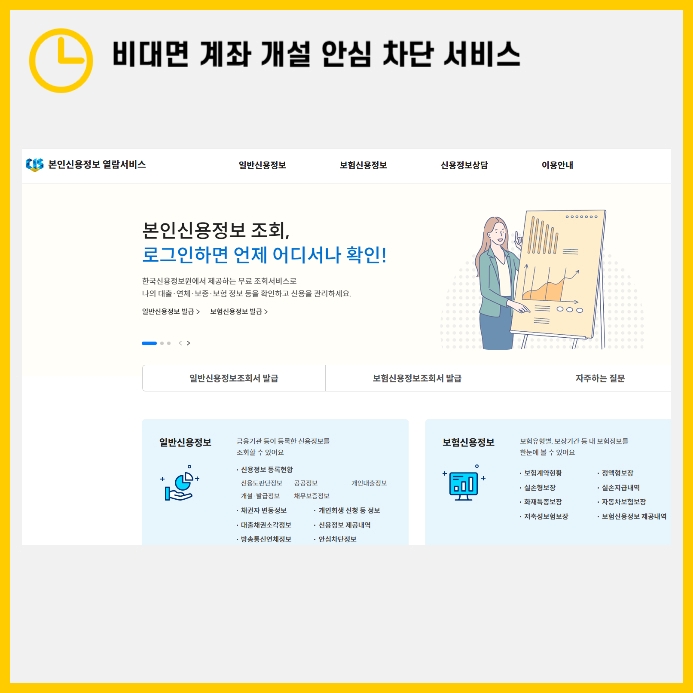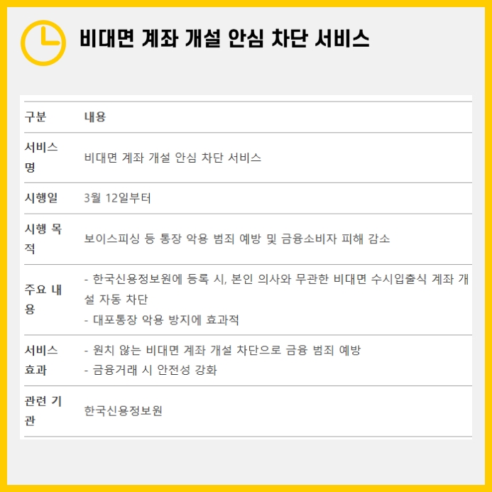 이 서비스는 금융소비자가 원하지 않는 비대면 계좌 개설을 차단하는 제도입니다. 3월 12일부터 금융당국이 시행한 정책으로, 한국신용정보원에 등록하면 본인의 동의 없이 비대면으로 개설되는 수시입출식 계좌를 자동으로 차단할 수 있습니다.