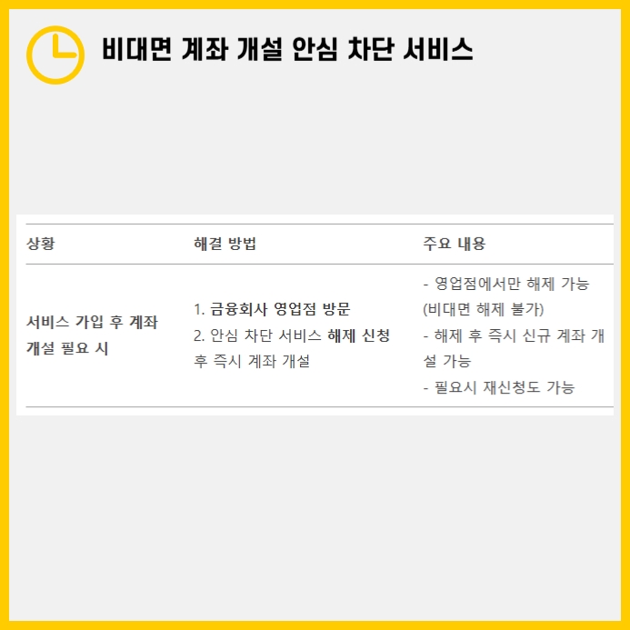 최근 금융사기를 이용한 대포통장 범죄가 늘어나면서 이러한 서비스의 필요성이 더욱 커졌습니다. 만약 비대면 계좌 개설이 필요하지 않다면 사전에 이 서비스를 신청해 불필요한 피해를 예방할 수 있습니다.