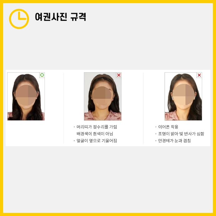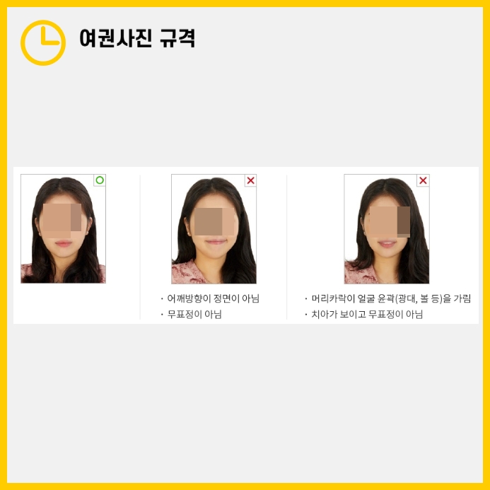 긴머리라면 가급적 앞머리를 옆으로 넘기고, 귀가 잘 보이도록 머리를 귀 뒤로 넘긴 후 촬영하는 것을 추천드립니다! 표정 역시 중요합니다. 반드시 무표정, 입을 다물고 치아가 보이지 않아야 하며, 살짝 웃는 것도 안 됩니다.