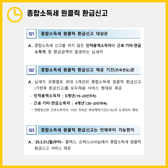 이번 ‘종합소득세 원클릭 환급신청’은 기존에 종합소득세를 신고하지 않았고, 일정 금액 이상의 환급이 발생하는 사람을 위해 준비된 서비스입니다. 인적용역이나 기타소득, 연금 또는 근로소득이 있었지만 별도로 신고하지 않은 경우에 해당될 수 있습니다.
