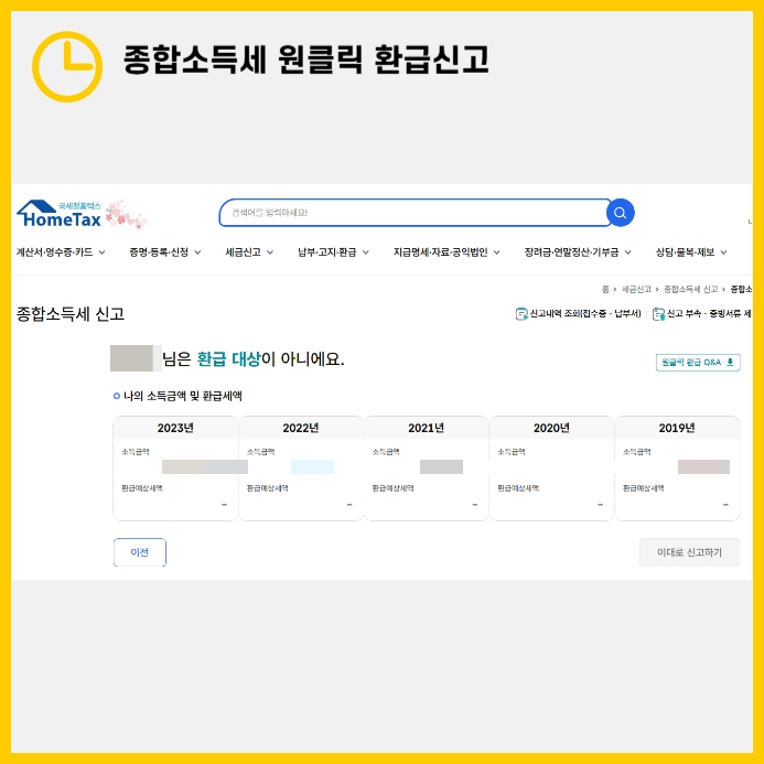 종합소득세 신고 시즌이 곧 돌아옵니다. 매년 5월이면 어김없이 세금 신고 알림이 찾아오는데요, 특히 올해는 ‘원클릭 환급신청’이라는 제도가 도입되어 신고하지 못한 환급액을 쉽게 신청할 수 있는 기회가 생겼습니다. 저도 혹시 해당되는지 궁금해서 홈택스에 접속해봤는데요, 이미 신고를 완료한 상태라 환급 가능한 금액은 조회되지 않았습니다. 아쉽지만 그만큼 저는 세금 정산을 잘하고 있었던 셈이겠죠. 대신 블로그를 통해 많은 분들이 이 혜택을 놓치지 않도록 안내드리고자 합니다.