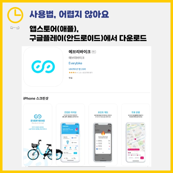 에브리바이크는 전용 앱 ‘에브리바이크’를 통해 이용할 수 있습니다.