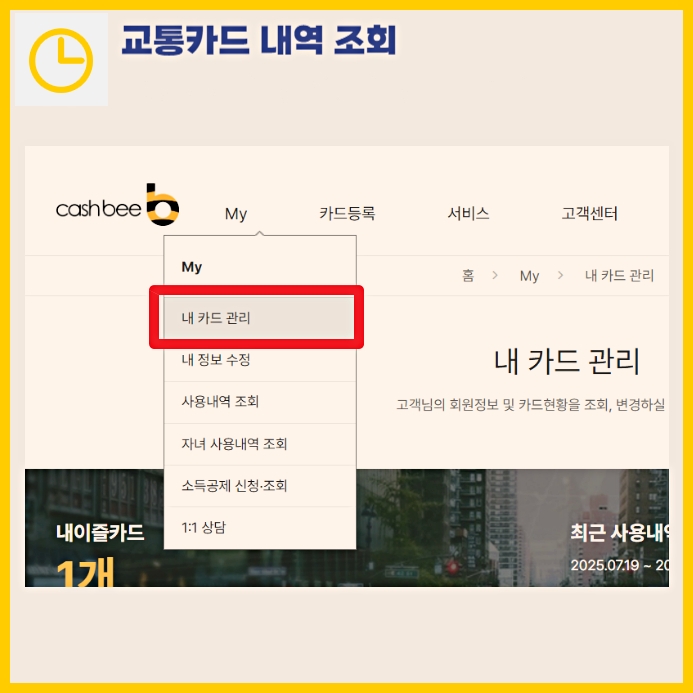 3. 내 카드 등록 → `MY캐시비 → 내카드관리 → 카드등록` 메뉴에서 교통카드를 등록합니다. → 카카오페이 모바일 교통카드도 여기서 등록이 가능합니다.